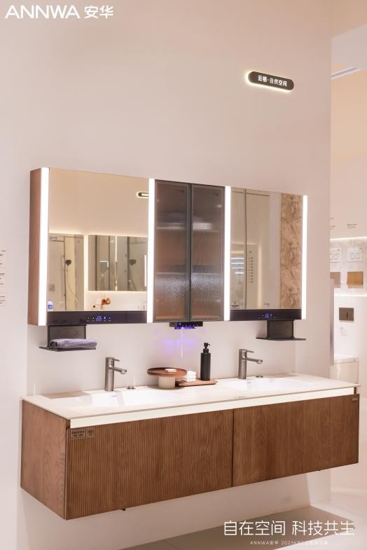 安华卫浴2025年KBC展会的核心命题,是将“科技共生”理念转化为触手可及的生活体验。围绕如厕、沐浴、收纳三大高频场景,安华推出全新解决方案——五大套系空间(私享·收纳空间、奢居·美学空间、云栖·自然空间、智净·健康空间、极简·悦己空间),精准匹配新婚家庭、独居青年、高净值人群的差异化需求,专属设计,随心定制。